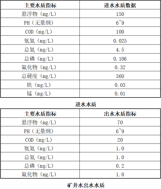 根據(jù)該煤礦的環(huán)評報告,礦井設(shè)計生產(chǎn)能力為60萬噸/年。礦井水的正常涌水量為800m³/d,最大涌水量為1332m³/d,礦井水的主要污染物為CODCr、SS;礦井涌水排至井底水倉,通過主排水泵將井下涌水沿副斜井敷設(shè)的排水管路排至地面礦井水處理站進行進一步處理,達到地表Ⅲ類水排放標準。